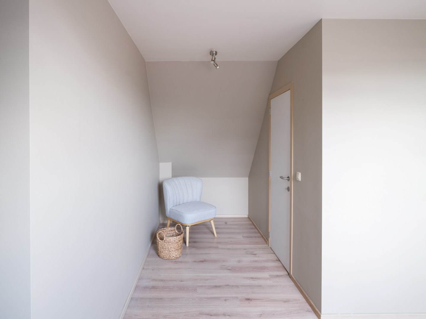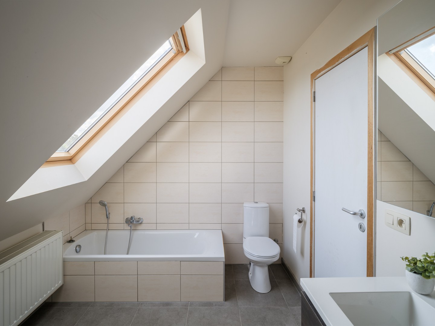 De bovenverdieping herbergt twee comfortabele slaapkamers en een volledig ingerichte badkamer met lavabo, ligbad, tweede toilet en aansluiting voor de wasmachine. Alles is ontworpen met oog voor praktisch gebruik en duurzaam wooncomfort.