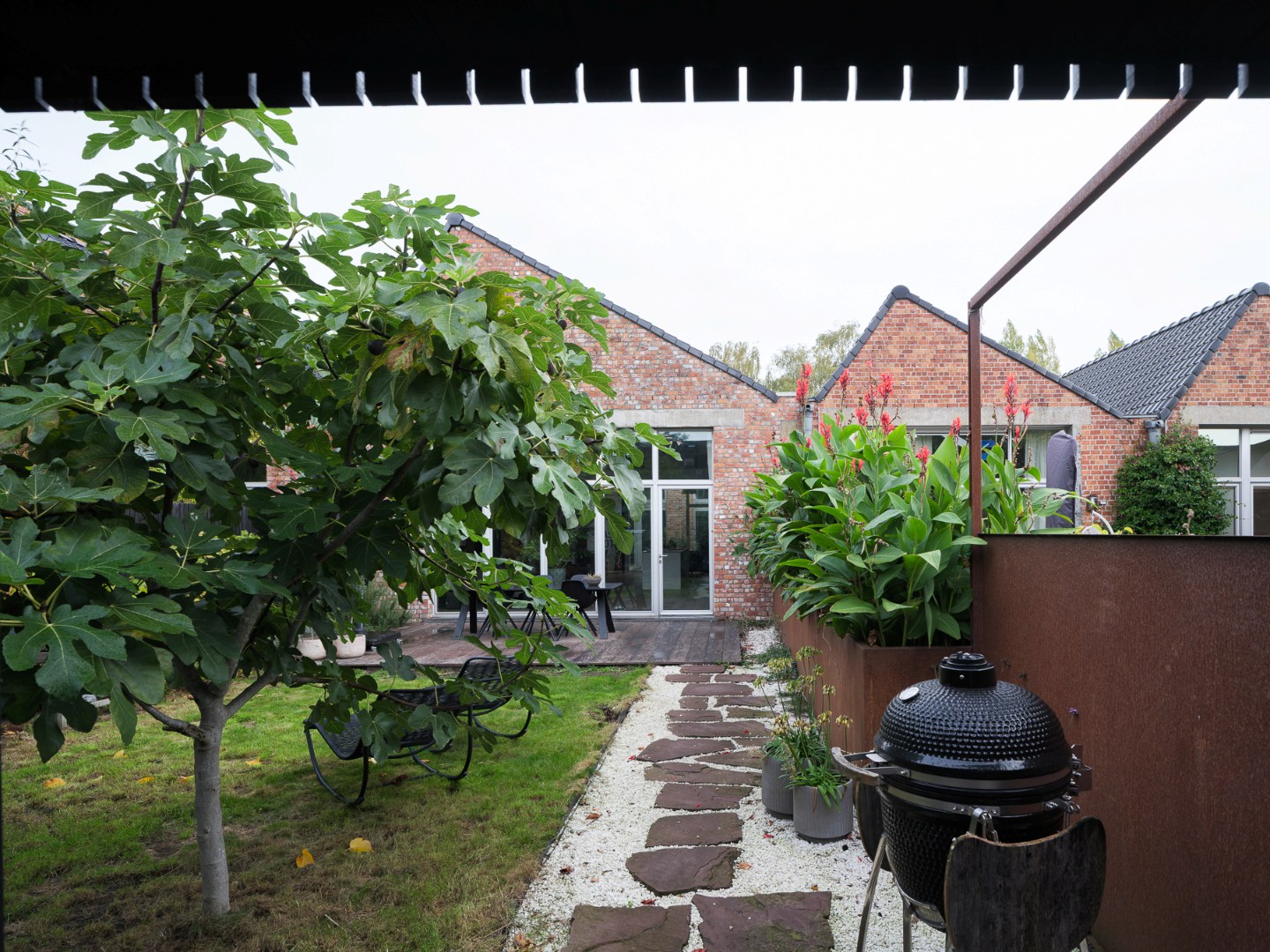 Via een goed verscholen privéweg komen we op de open binnenplaats met heel wat parkeergelegenheid. Hier bevindt zich de toegang tot het afgesloten privatief, met grote, zuidwestelijk georiënteerde tuin. Bovendien werden een gerieflijke buitenberging en fietsenstalling geïnstalleerd.