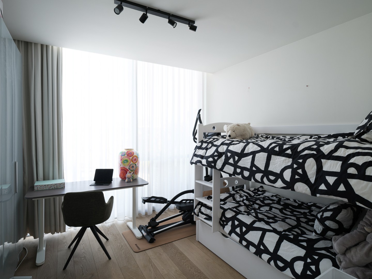 Het appartement beschikt over drie slaapkamers, elk met een aangenaam vloeroppervlak en eveneens rechtstreekse toegang tot een tweede ruim terras — een bijzonder pluspunt dat zelden voorkomt en extra gebruiksgemak biedt. De badkamer is netjes en functioneel afgewerkt, met het nodige comfort voor het hele gezin.