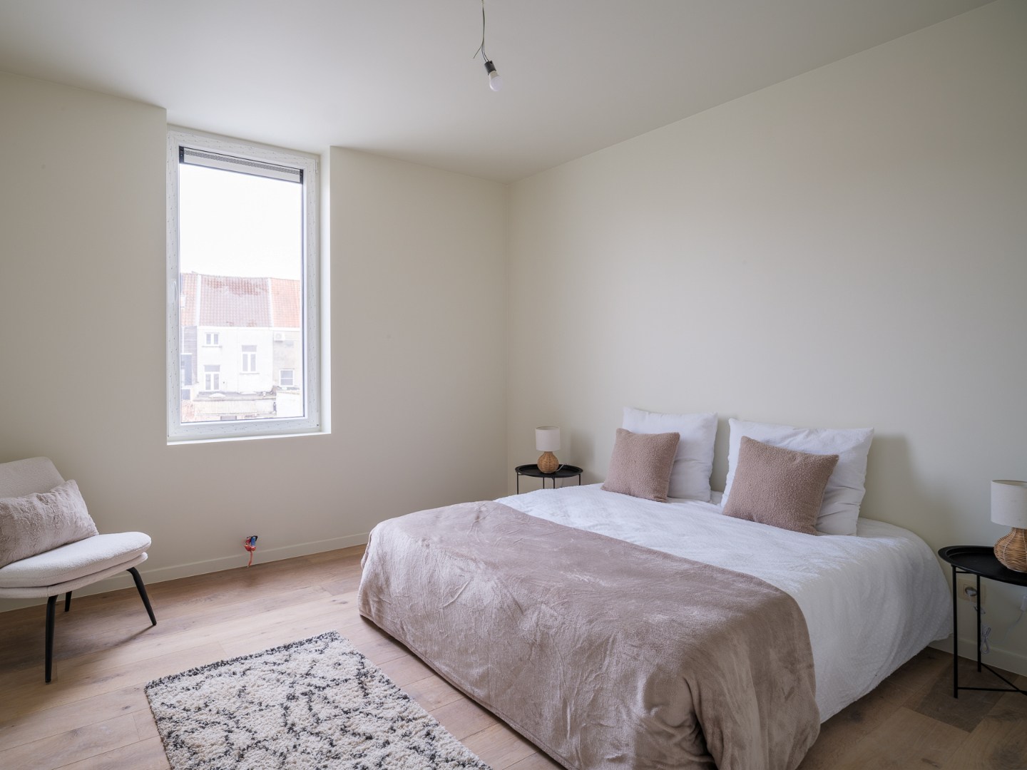 De leefruimte straalt warmte en elegantie uit dankzij het prachtige visgraatparket, dat naadloos aansluit bij de moderne afwerking van de woning. Aansluitend bevindt zich de volledig uitgeruste keuken, voorzien van alle hedendaagse toestellen en voldoende werk- en opbergruimte, ideaal voor wie graag kookt en ontvangt.